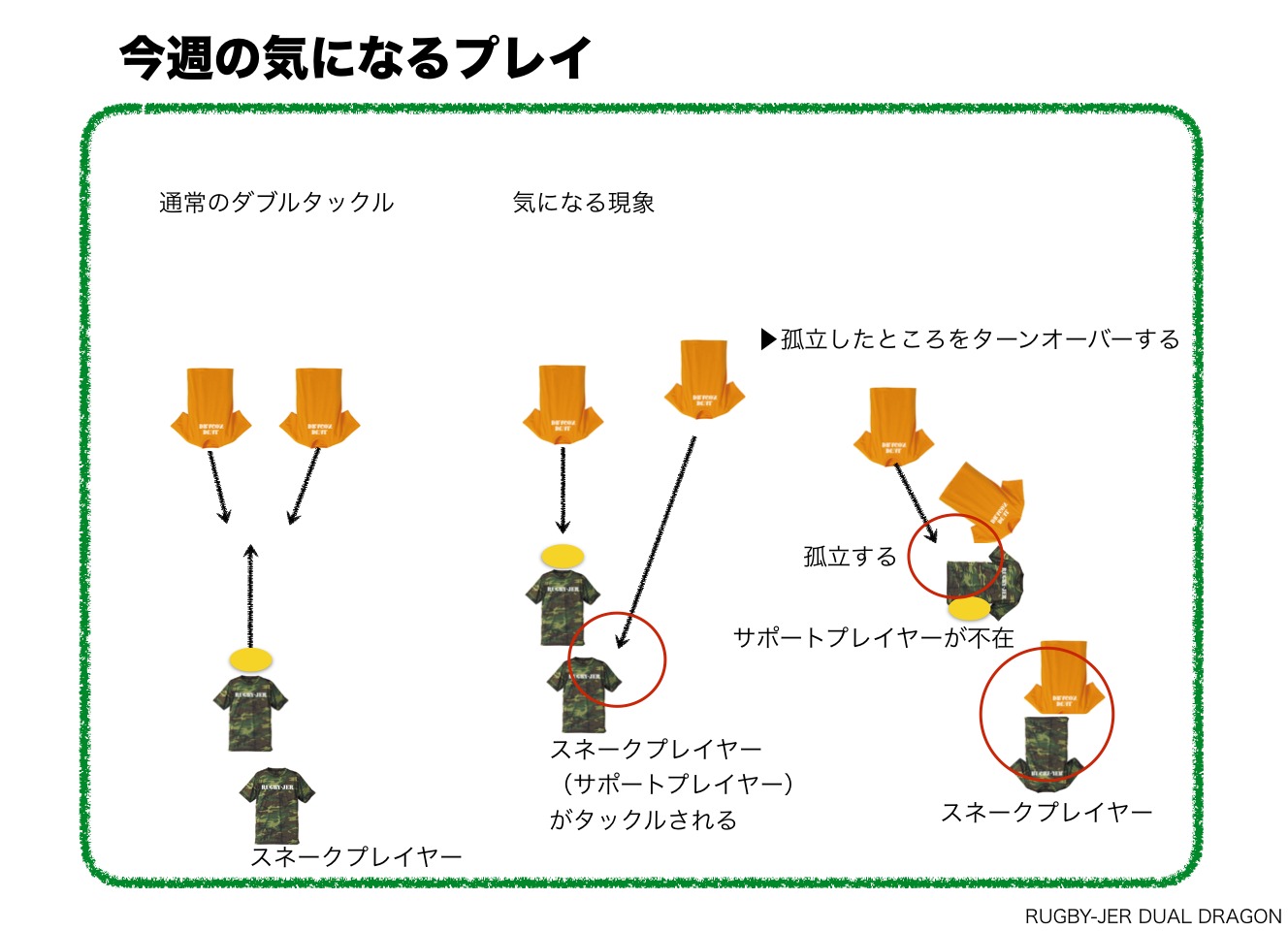 モダンラグビーでは、二個一やスネークプレイ、トラックアンドトレーラーなど呼び方はありますが、ボールキャリアをサポートしているプレイヤーに対して、意図的にタックルするプレイが目に付きました。タックルやモールの成立要件が満たされれば、問題ないでしょうが、あきらかに、サポートプレイヤーを剥ぐようなプレイをしていました。