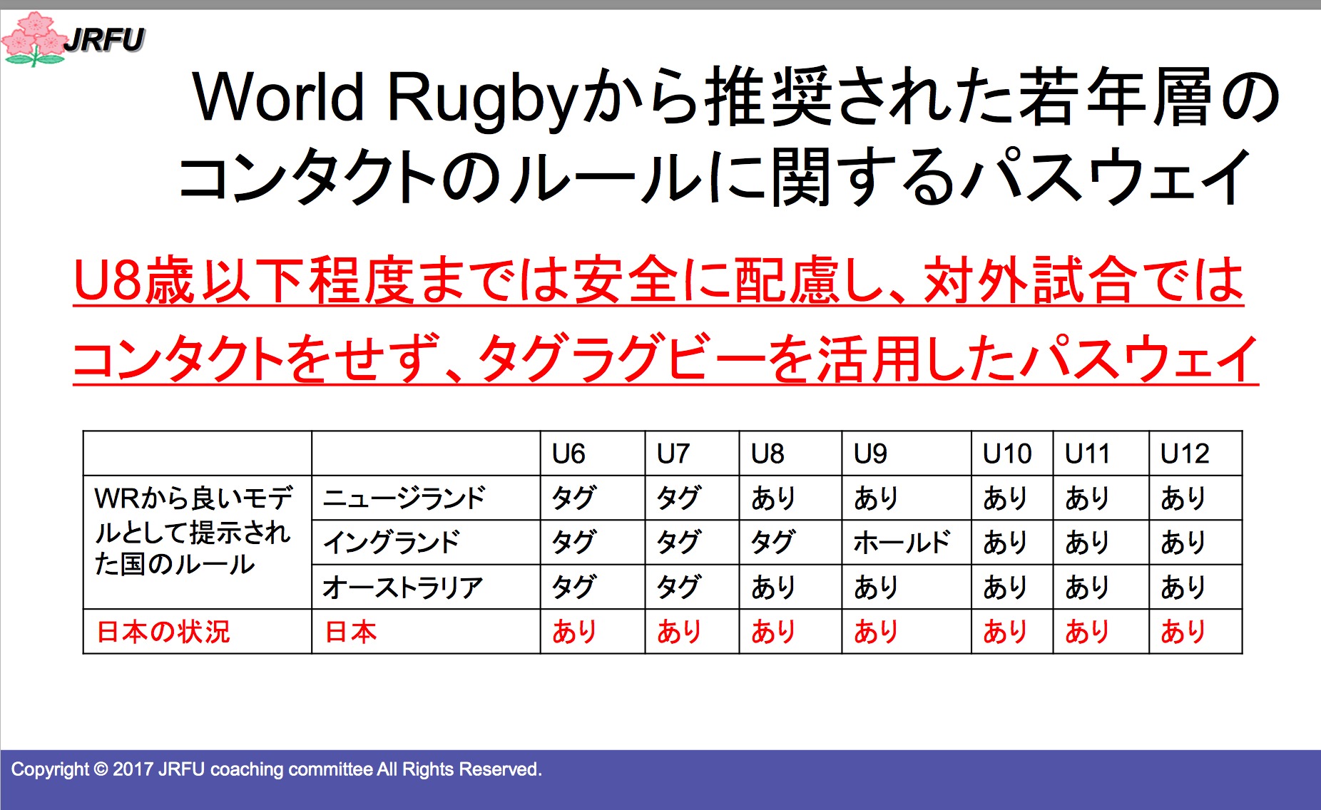で、調べてみると、日本協会がまとめている、各国のコンタクトについての検討は、興味深いものでした。若年層では、タグを用いてコーチングされており、WRがよい手本として推奨しています。競技人口の多いイングランドでは、タグ、ホールド、コンタクトという段階を踏んだ普及策がとられているのが、特に興味深く感じました。