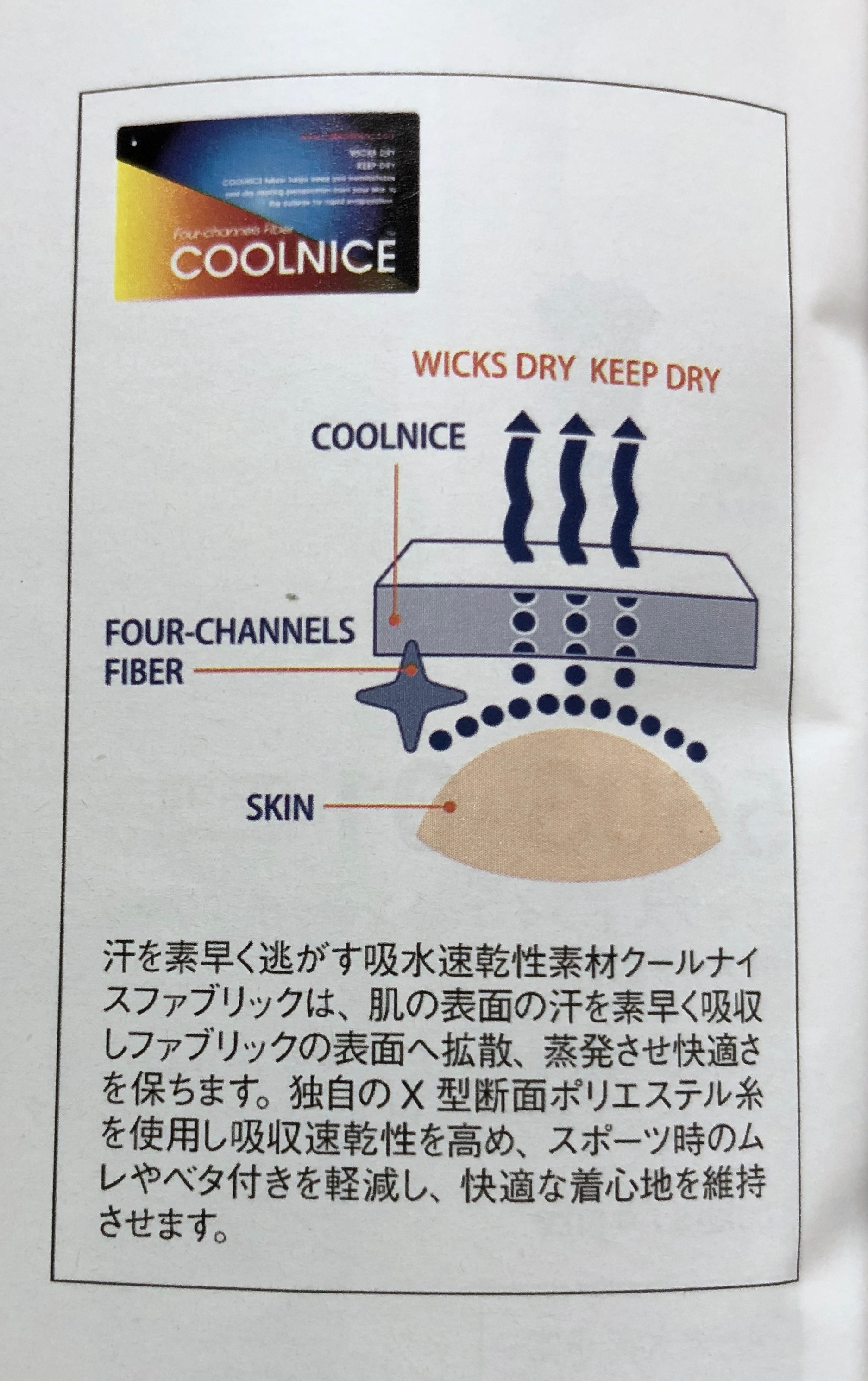 汗を素早く吸収し、素早く拡散、蒸発させる仕組みです。