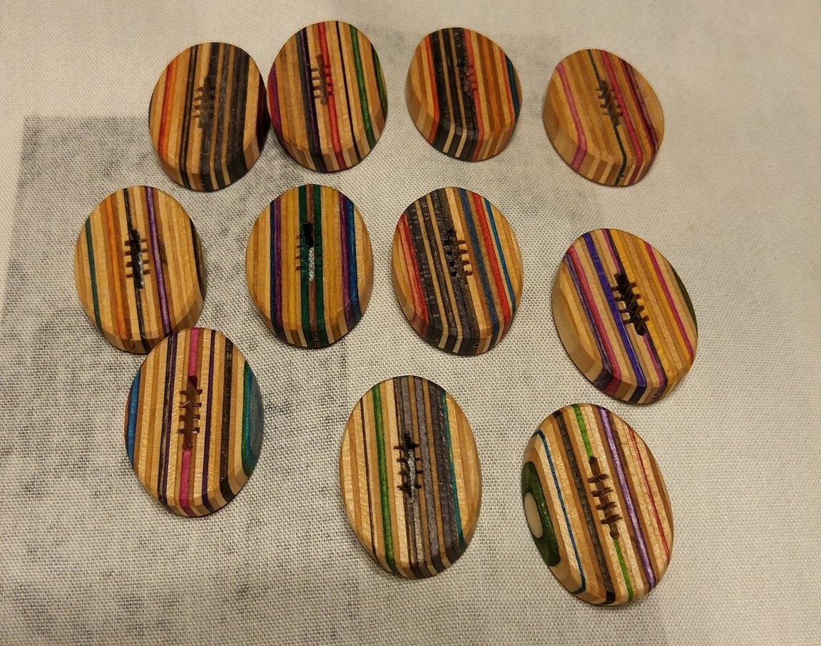 古くなったスケートボードを利用してハンドメイドで作ったラグビーボール型キーホルダーです。